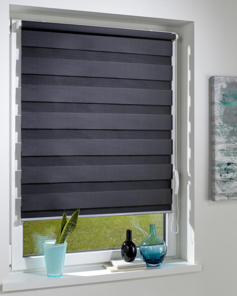 Individuelle Lichtregulierung durch abwechselnd transparent und blickdicht gewebtem Textil. In geschlossenem Zustand schützt Sie das Doppelrollo nicht nur vor übermäßiger Sonneneinstrahlung, sondern auch vor neugierigen Blicken.