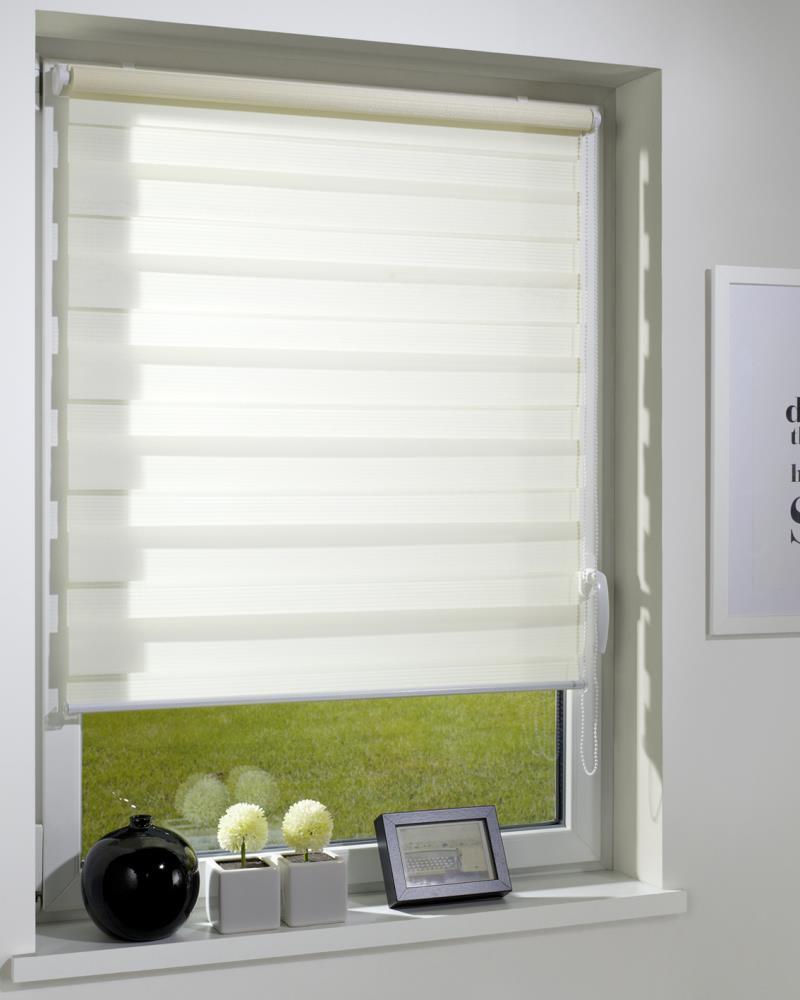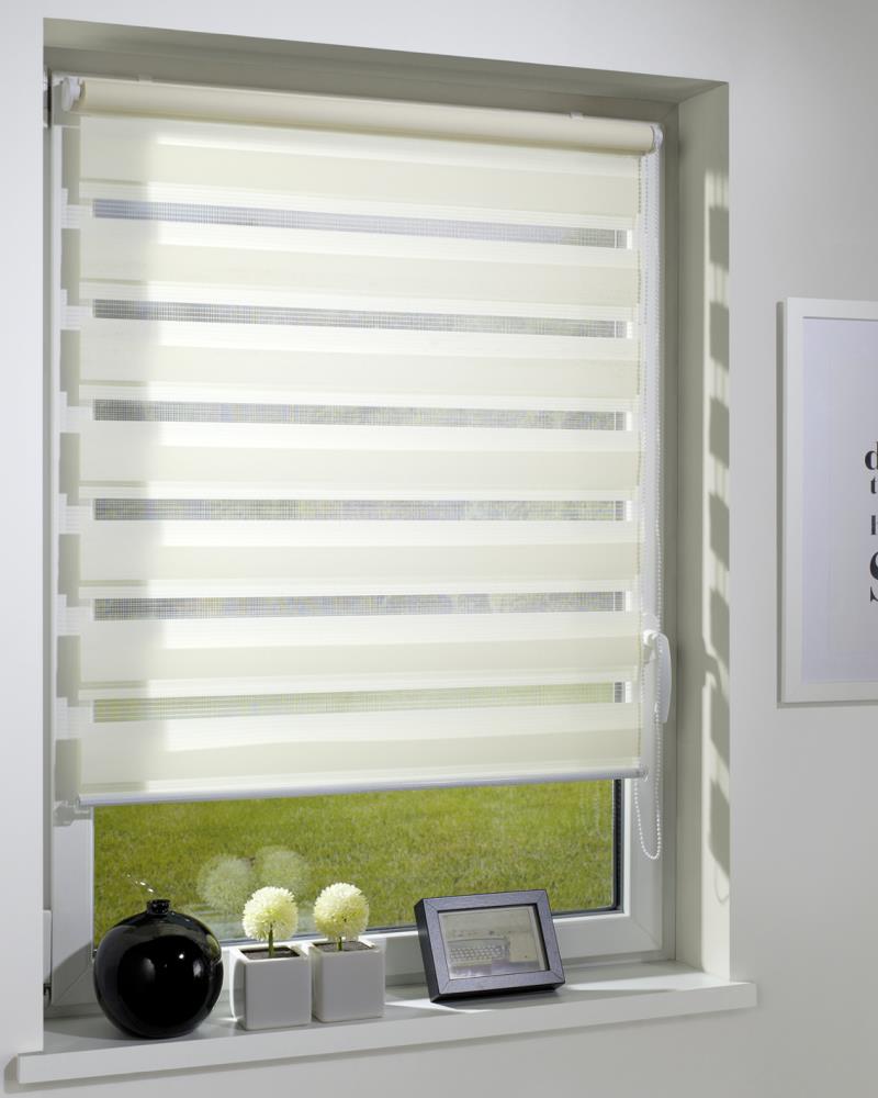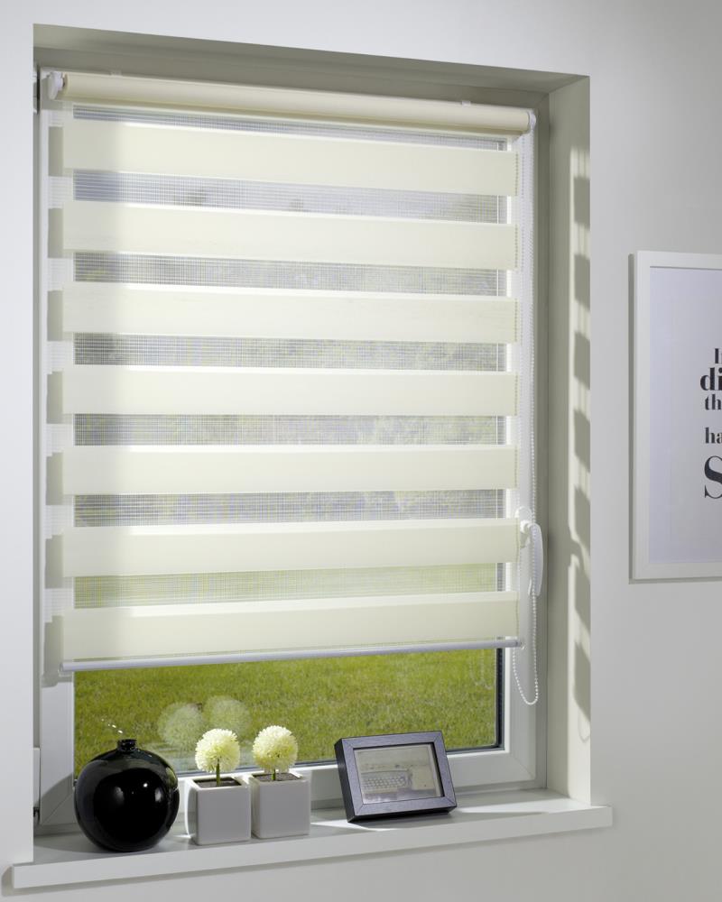 Individuelle Lichtregulierung durch abwechselnd transparent und blickdicht gewebtem Textil. In geschlossenem Zustand schützt Sie das Doppelrollo nicht nur vor übermäßiger Sonneneinstrahlung, sondern auch vor neugierigen Blicken.