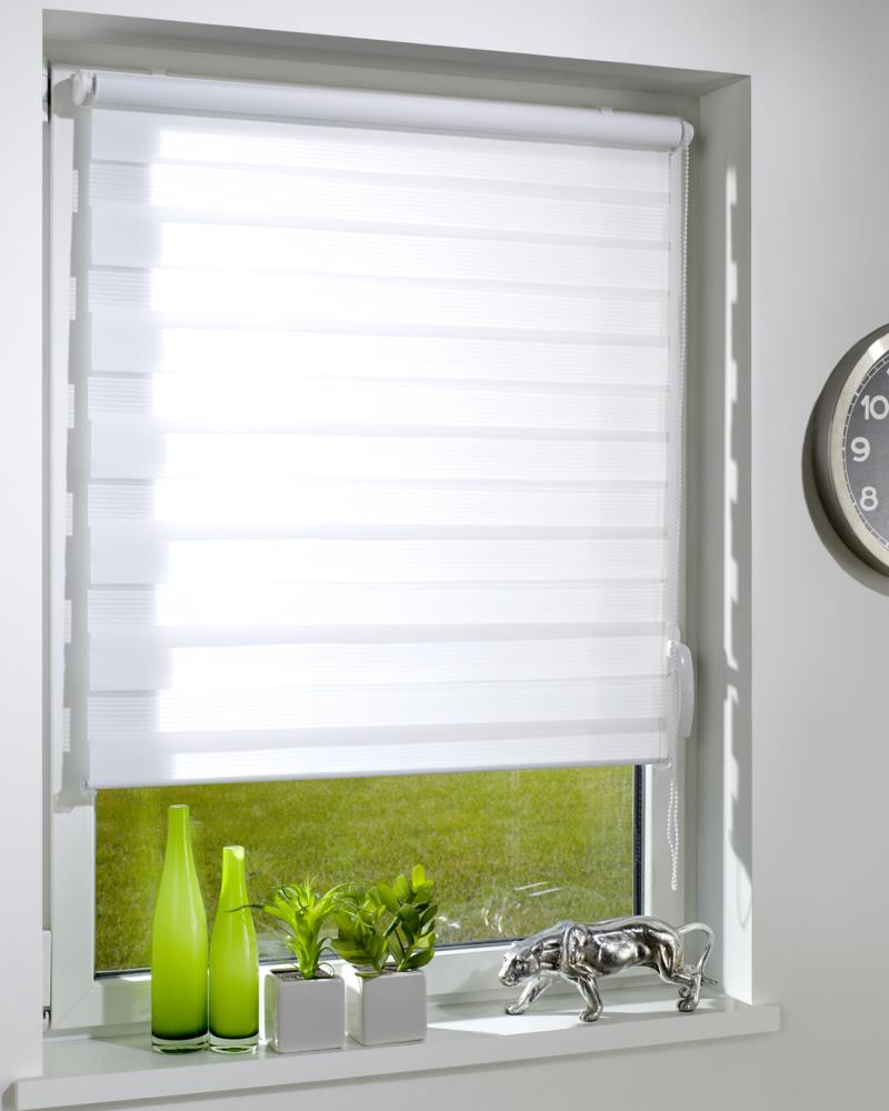 Individuelle Lichtregulierung durch abwechselnd transparent und blickdicht gewebtem Textil. In geschlossenem Zustand schützt Sie das Doppelrollo nicht nur vor übermäßiger Sonneneinstrahlung, sondern auch vor neugierigen Blicken.