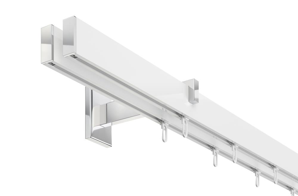 Dieses hochwertige 2-läufige Innenlauf Gardinenstangen Set, rechteckig, aus ALUMINIUM IN DEN FARBEN WEISS, SCHWARZ ODER SILBER ELOXIERT GEBÜRSTET, mit LANGEM DOPPEL-WANDTRÄGER und ENDKAPPEN IN VERCHROMTER AUSFÜHRUNG, zeichnet sich durch sein modernes und edles Design und seine gute Qualität aus.