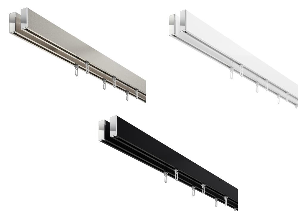 Hochwertiges 2-läufiges Innenlauf Gardinenstangen Set, rechteckig, aus ALUMINIUM in den Farben SILBER ELOXIERT GEBÜRSTET, SCHWARZ ODER WEISS mit Deckenhalterung und verchromten Endkappen - sein modernes, edles Design und seine gute Qualität begeistern. Verschönern Sie Ihr Zuhause!