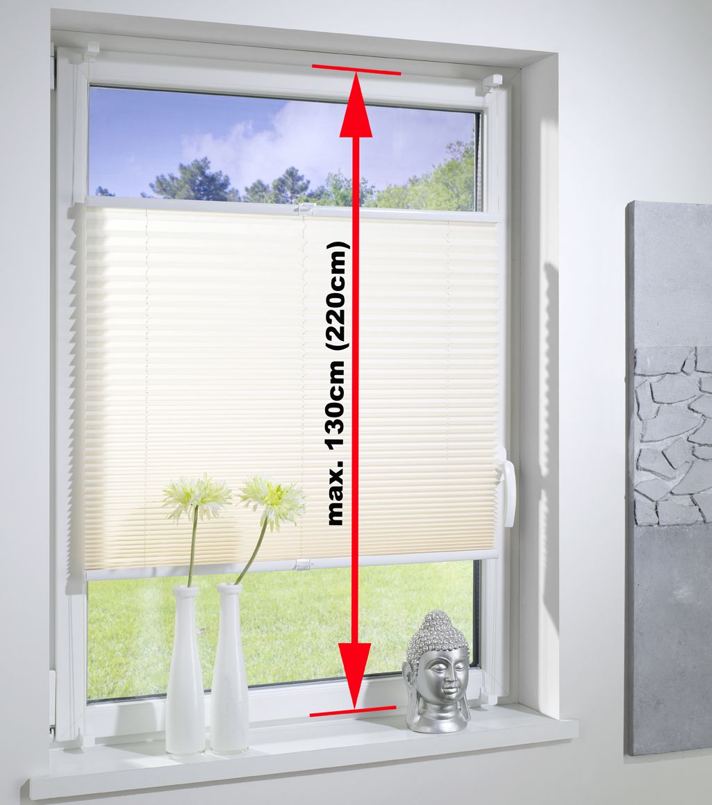 Die Plissees sind für eine maximale Gesamthöhe des Fensterflügels von 130 cm bzw. 220 cm – je nach Produkt und für Rahmenstärken bis 22 mm geeignet. Die Stoffbreite entspricht der Bestellbreite. Die Stofftiefe beträgt 20 mm.