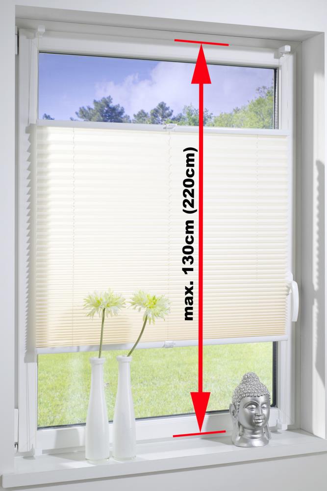 Die Plissees sind für eine maximale Gesamthöhe des Fensterflügels von 130 cm bzw. 220 cm – je nach Produkt und für Rahmenstärken bis 22 mm geeignet. Die Stoffbreite entspricht der Bestellbreite. Die Stofftiefe beträgt 20 mm.