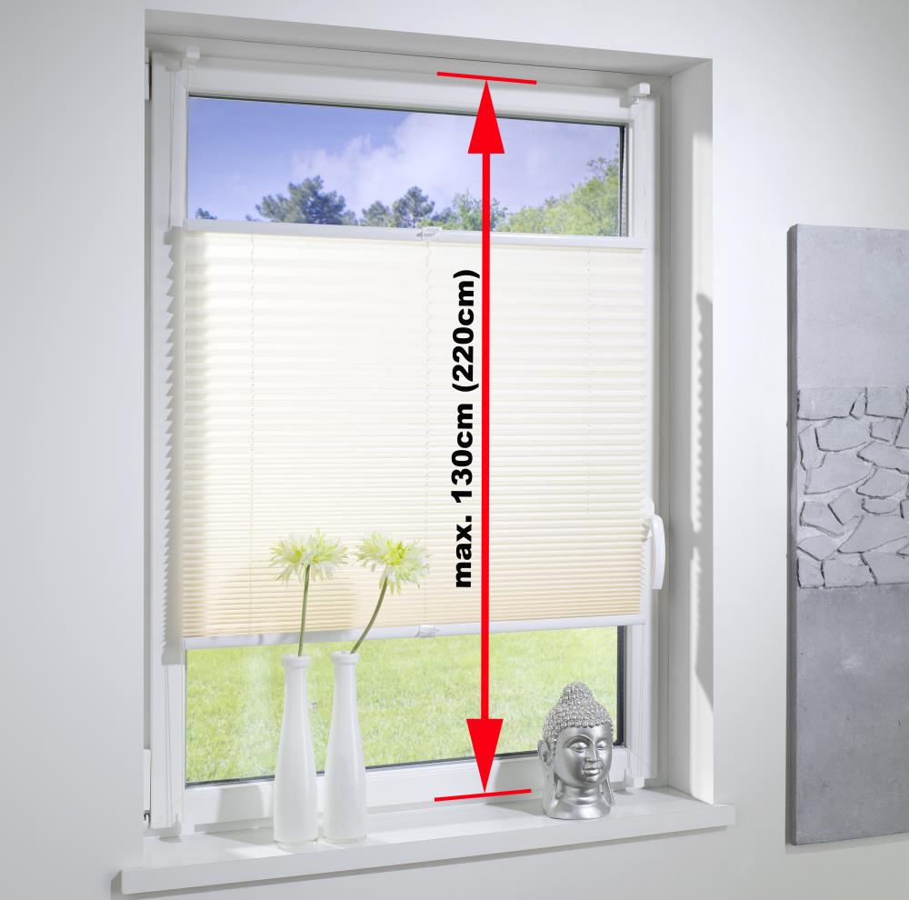 Die Plissees sind für eine maximale Gesamthöhe des Fensterflügels von 130 cm bzw. 220 cm – je nach Produkt und für Rahmenstärken bis 22 mm geeignet. Die Stoffbreite entspricht der Bestellbreite. Die Stofftiefe beträgt aufgrund der Wabenstruktur 25 mm.