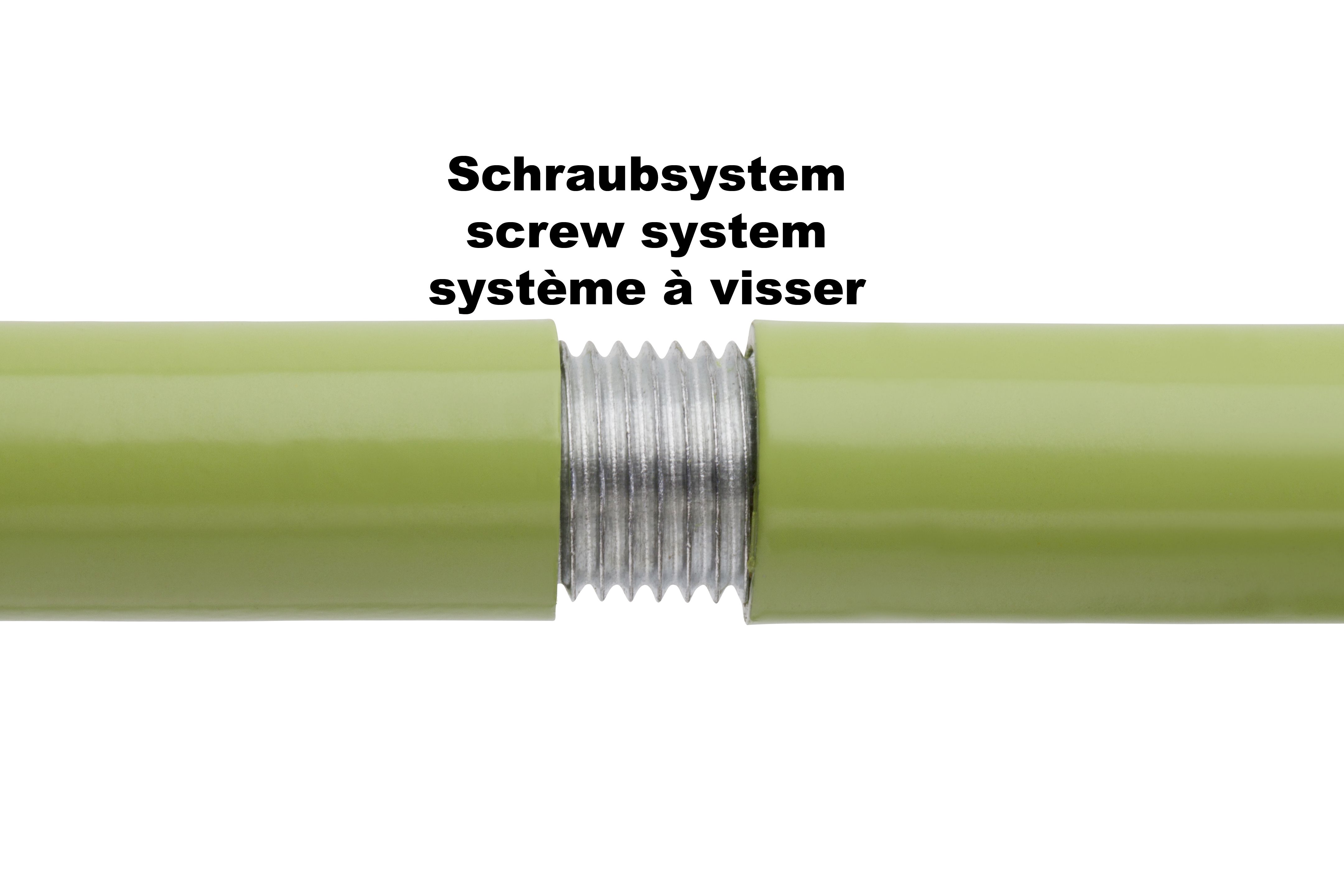 Farbe der Stangen, Träger und Endstücke: Anisgrün (Pantone 375). Die Stangen bestehen jeweils aus 2, 3 oder 4 Rohren à 58 cm, welche mittels stabilem Schraubgewinde zusammengefügt werden.